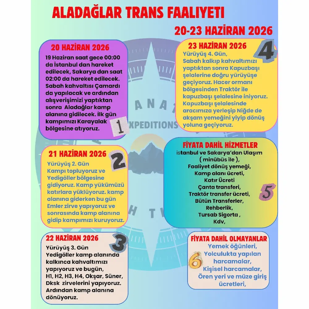 19 Haziran gece saat 00:00 da İstanbul dan araç hareket edecektir. Sırasıyla duraklara uğrayarak Sakarya dan saat 02:00 da ekibi alarak Niğde ye doğru yola çıkıyoruz, Sabah kahvaltısını Çamardı da yapıyoruz ardından alışverişimizi yaptıktan sonra karayalak kamp alanına gidiyoruz ve kampımızı kuruyoruz.