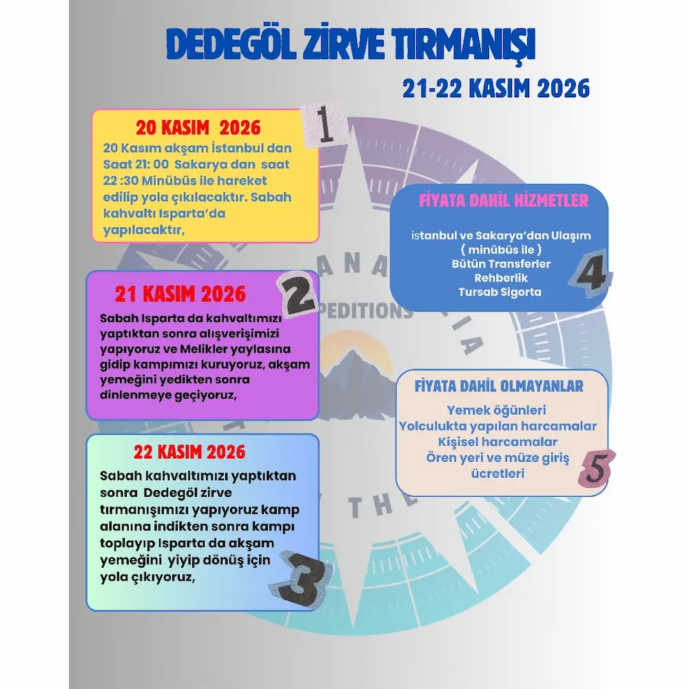 Sabaha karşı saat 04:00 da zirve tırmanışı için yola çıkıyoruz, Zirveye çıktıktan sonra kamp alanına gelip kampımızı toplayıp Isparta ya iniyoruz akşam yemeğini yedikten sonra dönüş için yola çıkıyoruz .