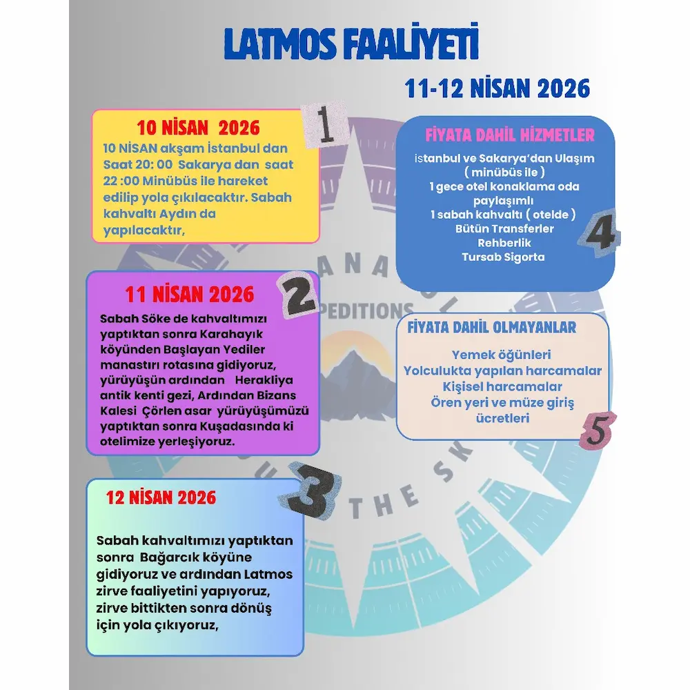 Sabah kahvaltımızı yaptıktan sonra Latmos zirve yürüyüşü için yola çıkıyoruz, zirve tırmanışımız Çam ağacı ormanları içinde olacak ve eşsiz Bafa gölü manzarası ile tırmanışımızı yapıyoruz, ardından dönüş için yola çıkıyoruz, akşam yemeğini Aydın yada İzmir de yedikten sonra önce Sakarya ve İstanbul yolculuğumuzu tamamlayıp faaliyetimizi bitiriyoruz.