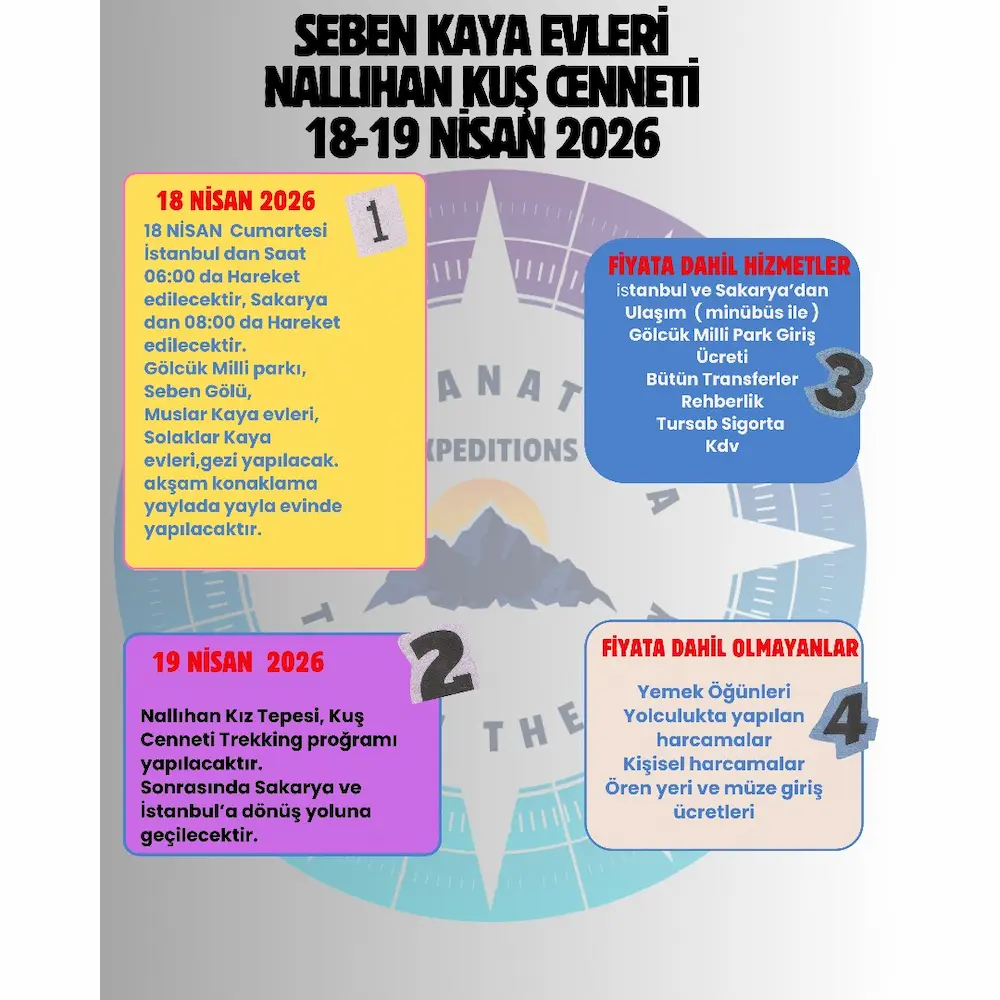 İlk mola Bolu Highway Outlet Avm de mola verilecektir, ardından ilk olarak Gölcük milli parkı gezilecektir, sonrasında Seben gölü, Seben solaklar kaya evleri, seben Muslar kaya evlerini gezdikten sonra Seben de Yayla evinde kalınacaktır, Çadır kurmak isteyenler yaylada çadır kurabilirler. Akşam yemeği burada ortak şekilde yapılıp yenecektir. Yemek olarak mangal yapabiliriz tutar ortak olarak bölünecektir.